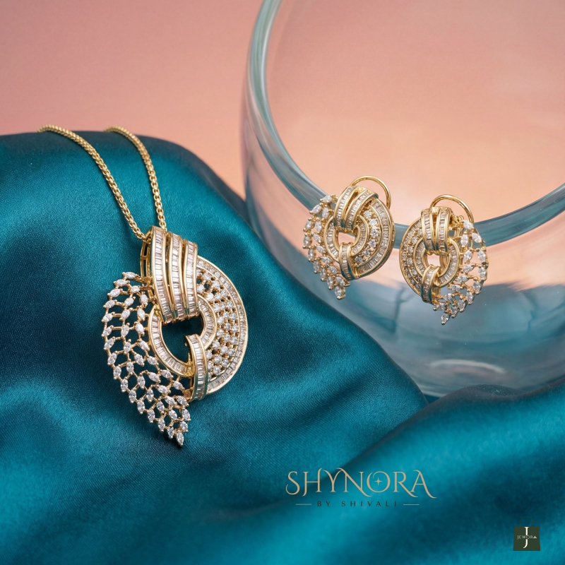 The Celestial Swirl CZ Pendant Set is a modern statement piece crafted for elegant, confident styling. Featuring a bold circular swirl design, the pendant showcases layered rows of sparkling cubic zirconia stones accented with sleek gold-tone bars for a contemporary finish. The matching earrings mirror the same graceful swirl motif, creating a perfectly balanced and luxurious look.