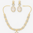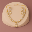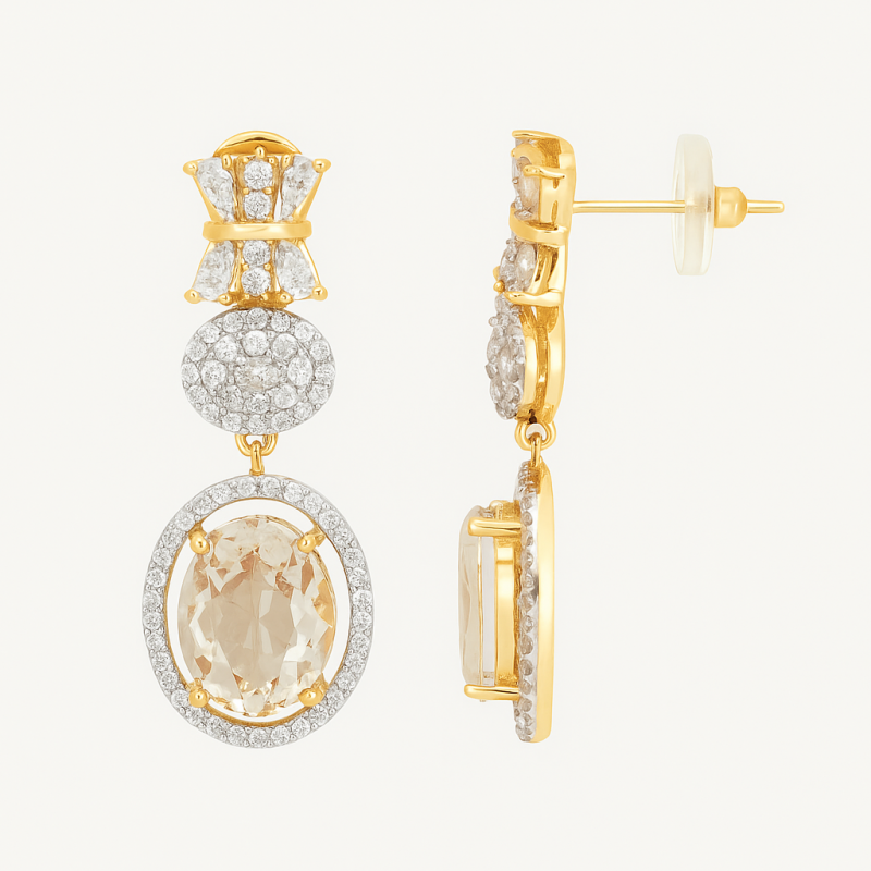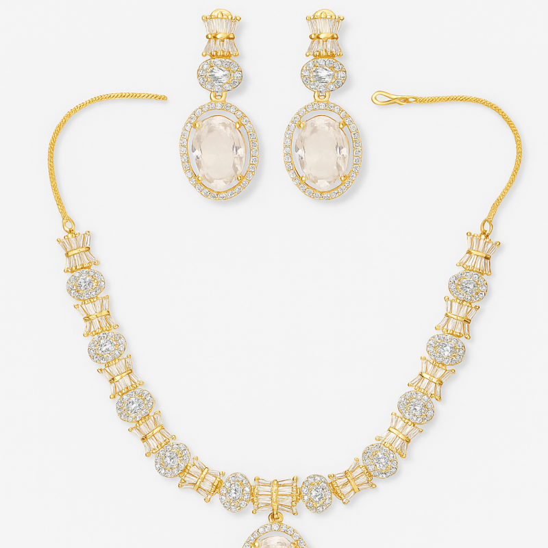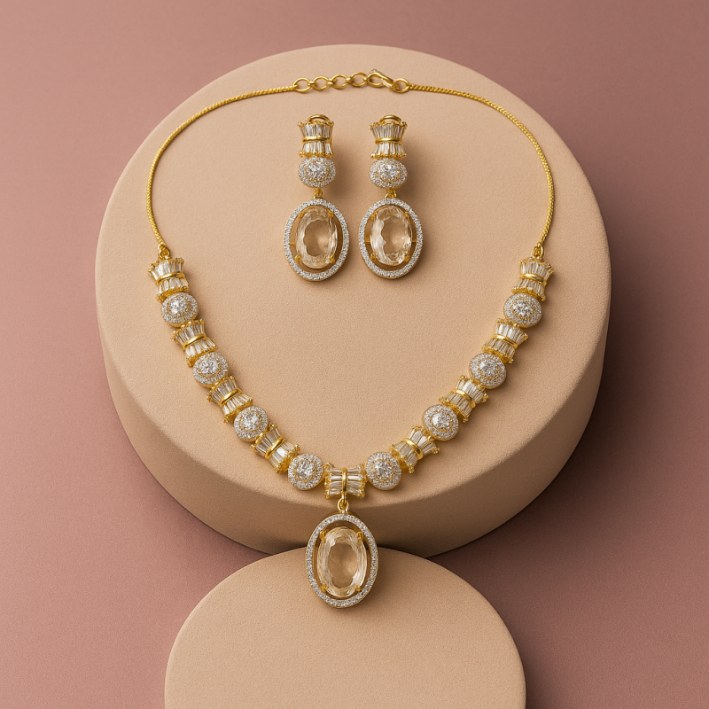 Elevate your look with this sophisticated Champagne Oval Pendant Necklace Set, crafted to bring out a refined elegance in every occasion. The necklace features a brilliant gold-plated chain adorned with sparkling American Diamonds, leading to a striking oval champagne-colored centerpiece stone that exudes luxury. Paired with matching drop earrings, this set offers a perfect balance of shimmer and subtlety. The timeless design is versatile enough for festive occasions, weddings, or evening gatherings, ensuring you always stand out with grace. With its rich detailing and elegant craftsmanship, this jewelry set is a must-have for anyone who loves classic beauty with a modern edge.