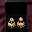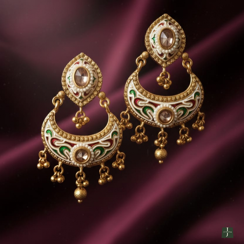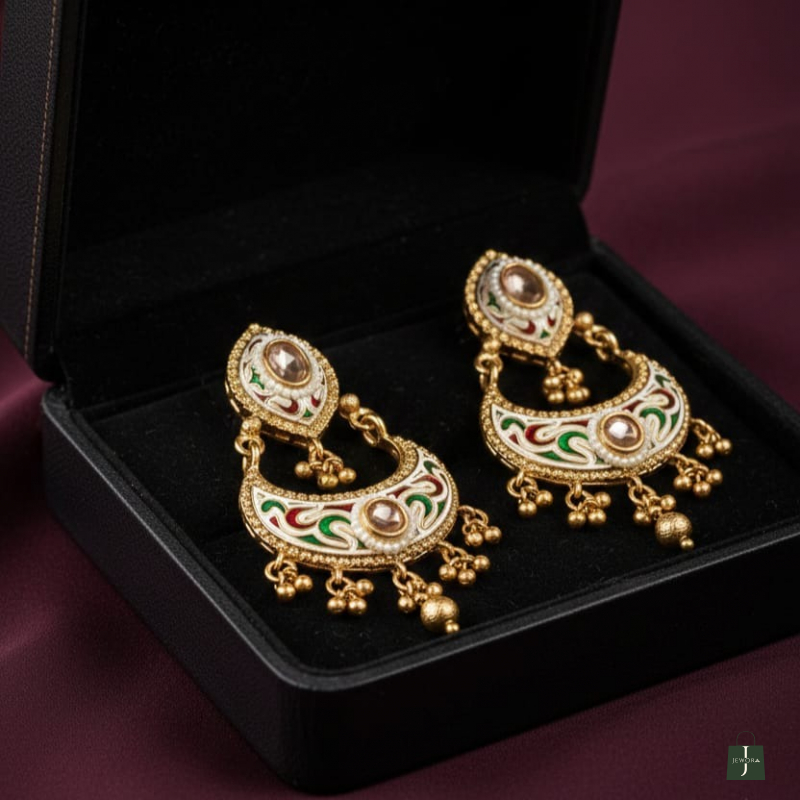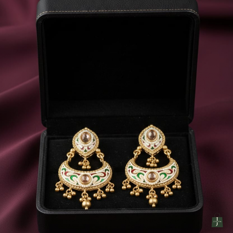 These exquisite traditional earrings (Chandbali) showcase a timeless design inspired by classic Indian craftsmanship. Crafted in a rich gold tone, they feature elegant crescent-shaped motifs adorned with delicate enamel work in white and green, accented by sparkling stone settings. The dangling gold beads add graceful movement, making the earrings perfect for weddings, festive occasions, or ethnic ensembles that call for royal elegance and heritage charm.
