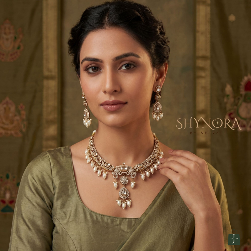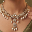 The Chandrika Pearl Polki Choker Set is a timeless expression of royal elegance. Designed in a rich antique-gold finish, this choker features intricately carved motifs adorned with shimmering polki-style stones and soft ivory pearl drops. The central teardrop pendant adds graceful movement, while the layered pearl detailing lends a classic, heirloom-inspired charm.