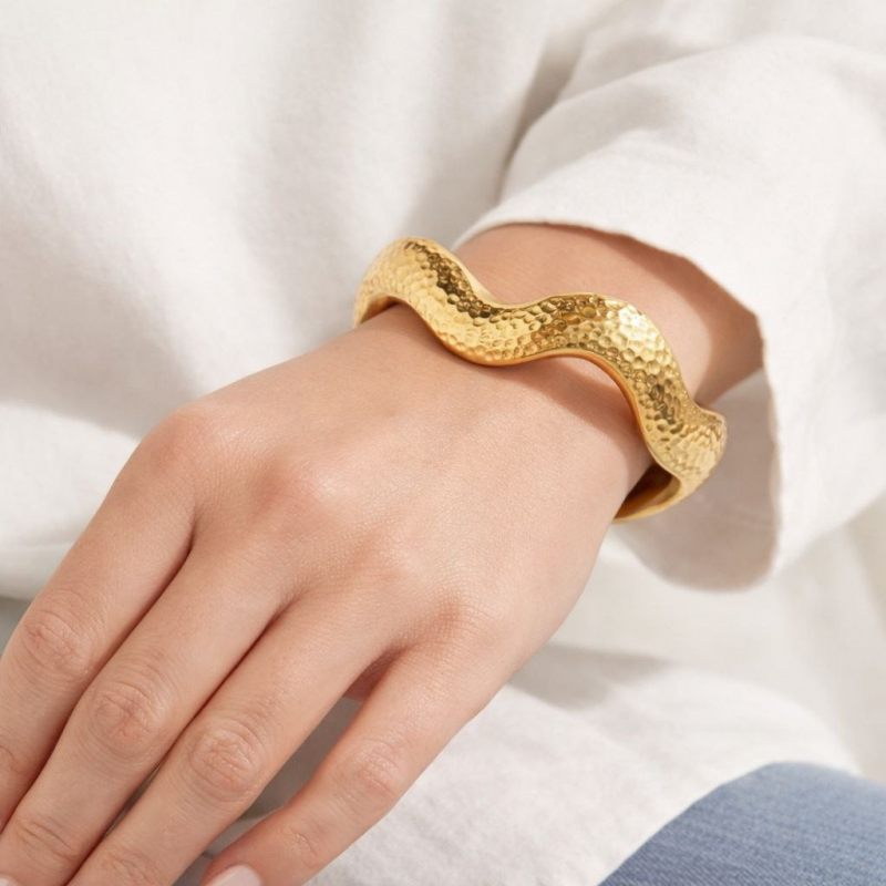 Waves of gold. Waves of compliments. — Our Chunky Gold Hammered Wave Bangle Bracelet is a breathtaking sculptural piece featuring a wide wavy silhouette with a rich all-over hammered texture that catches light from every angle with a warm, earthy glow. Organic. Artistic. Absolutely stunning. 💛✨