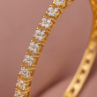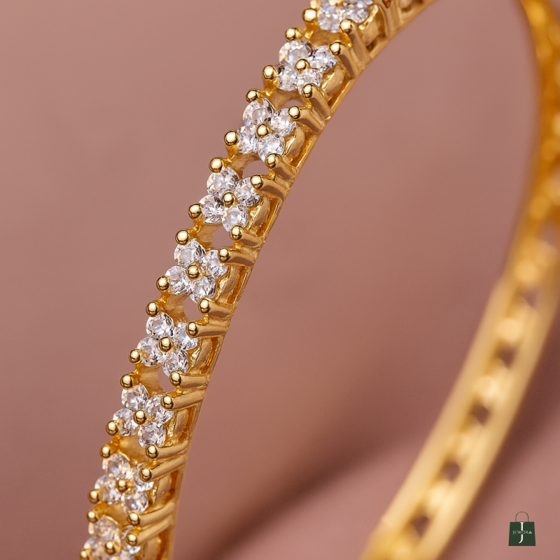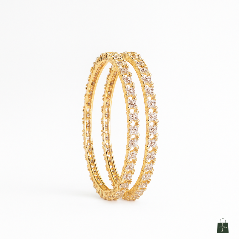 The Classic AD Gold Bangles are designed to add a refined sparkle to your collection, combining timeless elegance with modern appeal. Featuring a radiant gold polish, these bangles are adorned with closely set American Diamond (CZ) stones arranged in a clustered design that reflects light beautifully from every angle. The intricate stonework gives them a luxurious shimmer, making them ideal for women who appreciate jewelry that is both elegant and versatile. Lightweight yet durable, these bangles are comfortable for all-day wear while still maintaining a rich, high-end look. Perfect for festive gatherings, weddings, or evening events, they can be paired seamlessly with traditional attire such as sarees and lehengas, or styled with western outfits like cocktail gowns for a fusion touch. This set of two bangles can be worn together for a complete look or stacked with other designs for a more dramatic statement. Whether you’re dressing up for a special occasion or looking to elevate everyday wear, the Classic AD Gold Bangles deliver unmatched sophistication and charm.
