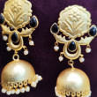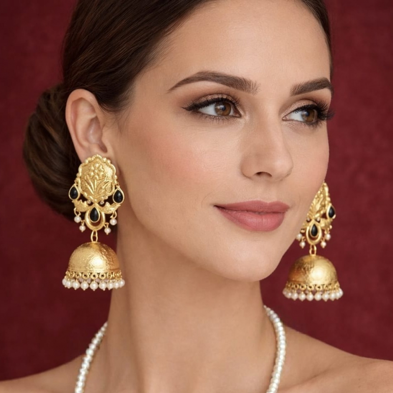 Add timeless elegance to your ethnic collection with these beautifully crafted matte gold jhumka earrings. Featuring a floral embossed top design, accented with glossy black teardrop stones, these earrings create a striking contrast. The traditional dome-shaped jhumka is finished with delicate pearl danglings, enhancing its graceful movement and charm. Perfect for festive occasions, weddings, and traditional celebrations