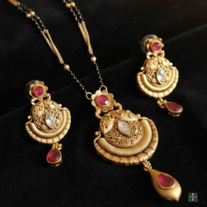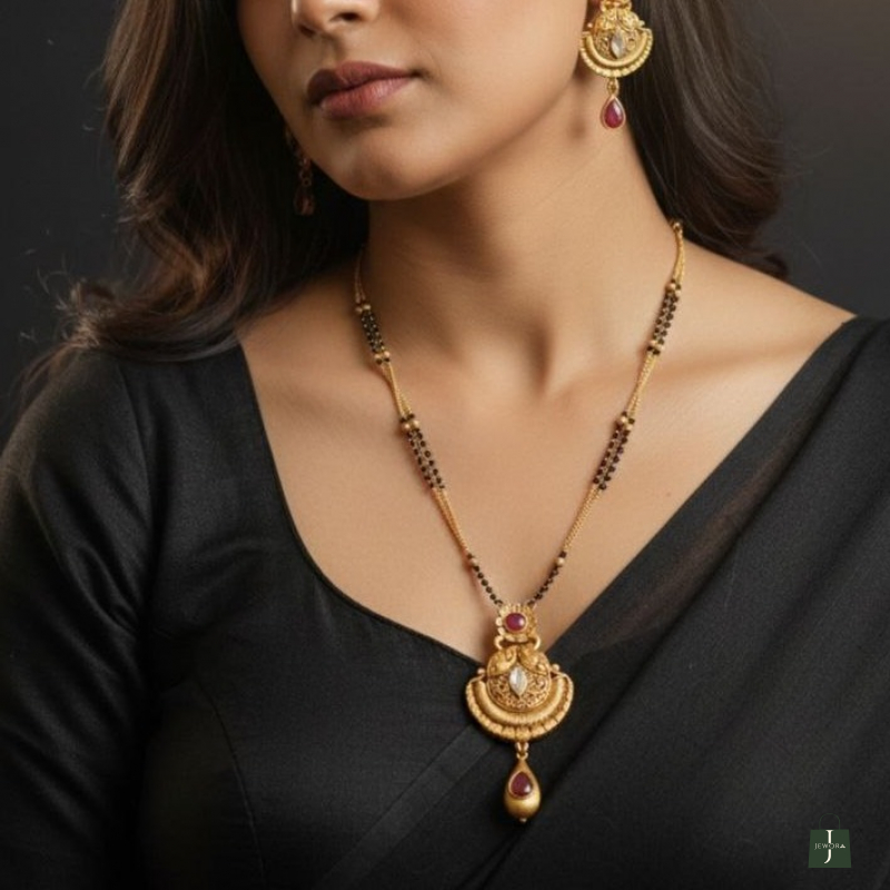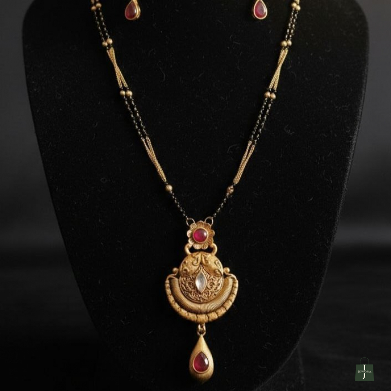 Traditional daily wear imitation mangalsutra with black beads and gold-plated pendant. Lightweight, durable, and ideal for everyday use.