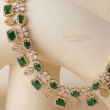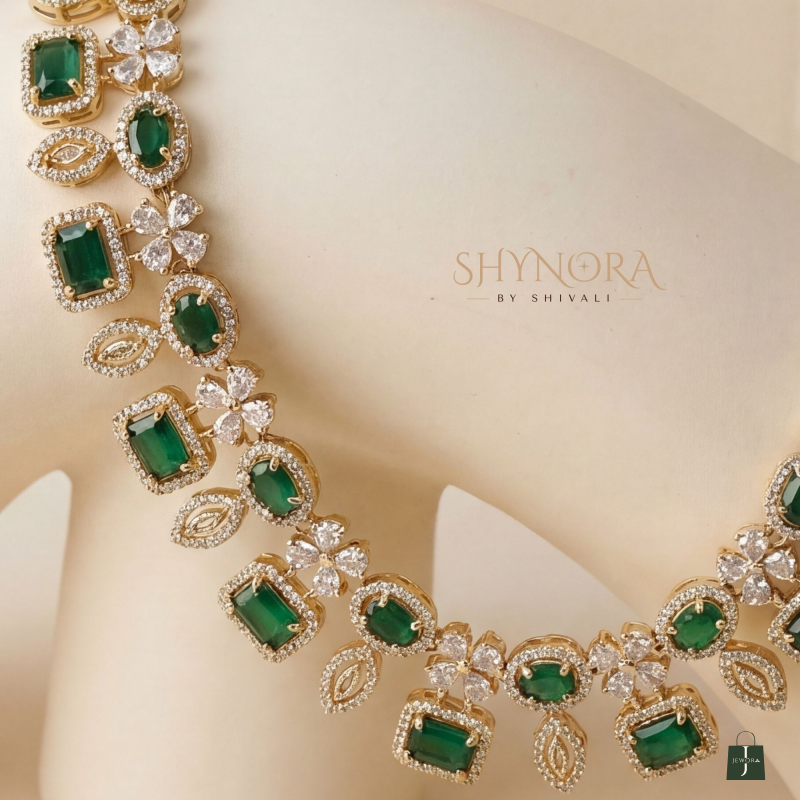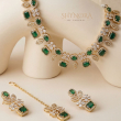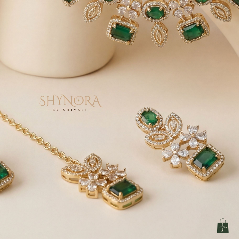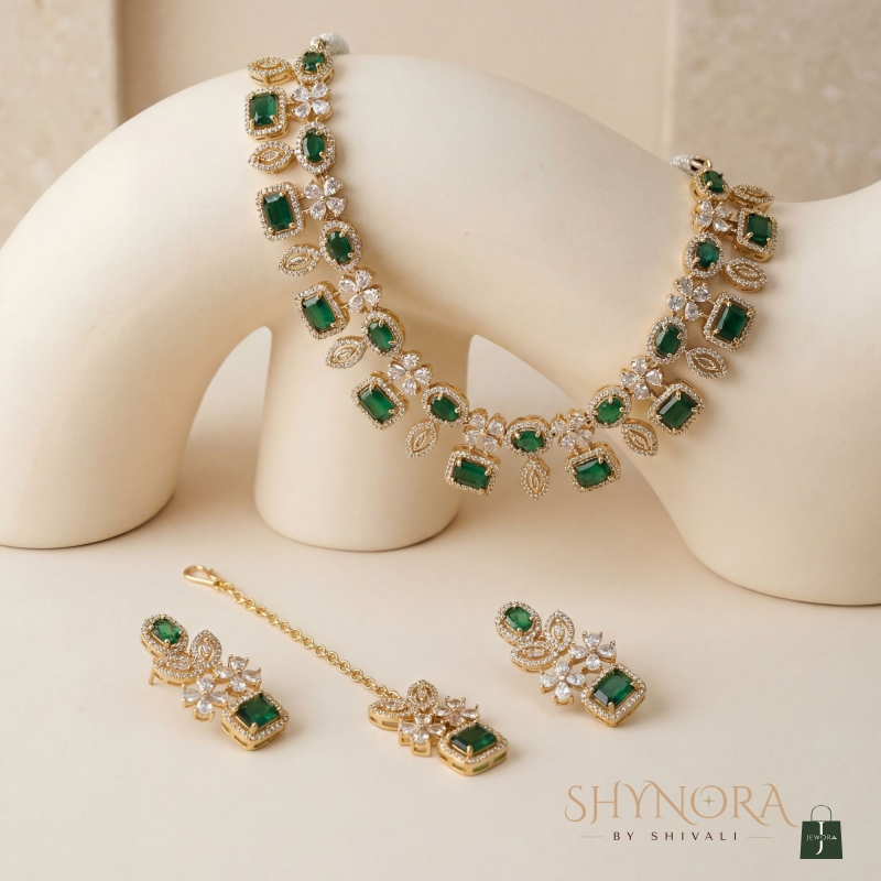 The Classic Emerald Square Stone AD Necklace Set is a timeless piece crafted with deep emerald green square stones beautifully highlighted by shimmering American Diamonds. Designed in an elegant gold-polish finish, the necklace features a refined pattern of geometric and floral motifs that sit gracefully on the neckline. Paired with matching earrings and a coordinating maang tikka, this set adds a rich and sophisticated touch to weddings, festive functions, and traditional celebrations.