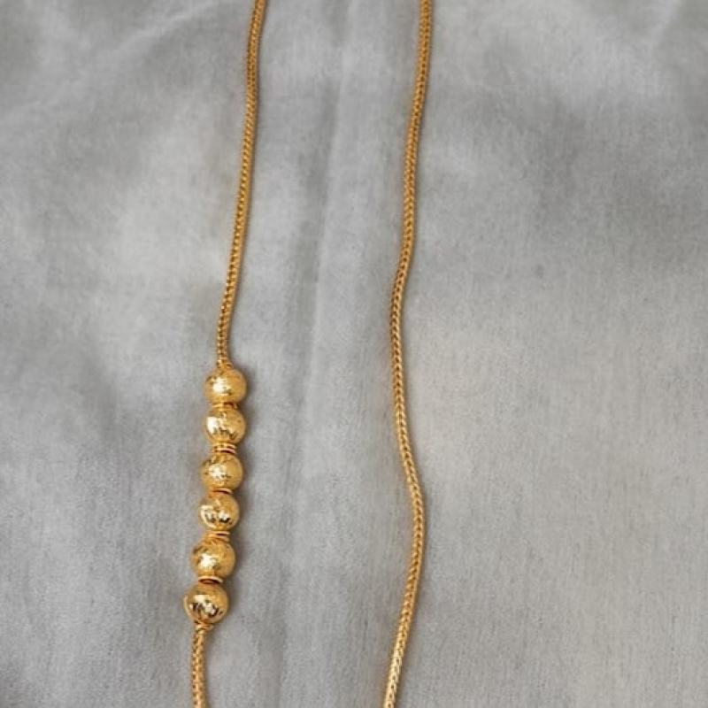 Elegant gold chain necklace featuring a delicate rope-style chain with five spherical gold beads spaced linearly on one side, creating a minimalist yet stylish focal point. The simple clasp ensures easy wear, making it a versatile accessory for everyday glam or special occasions. ✨