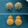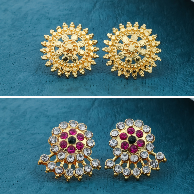 This elegant combo set includes six uniquely designed stud earrings crafted with a gold-tone polish and decorative stones. The set features a mix of floral crystal studs, ruby-accented statement studs, textured gold bead designs, geometric crystal clusters, and intricate traditional circular motifs. Each pair offers a different style, making it perfect for everyday wear, festive occasions, and party looks. The sparkling stones and detailed gold finish give the earrings a classy and versatile appearance.