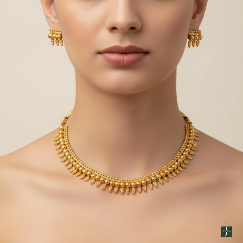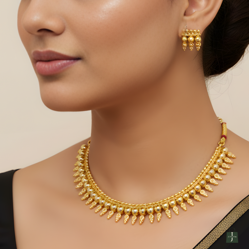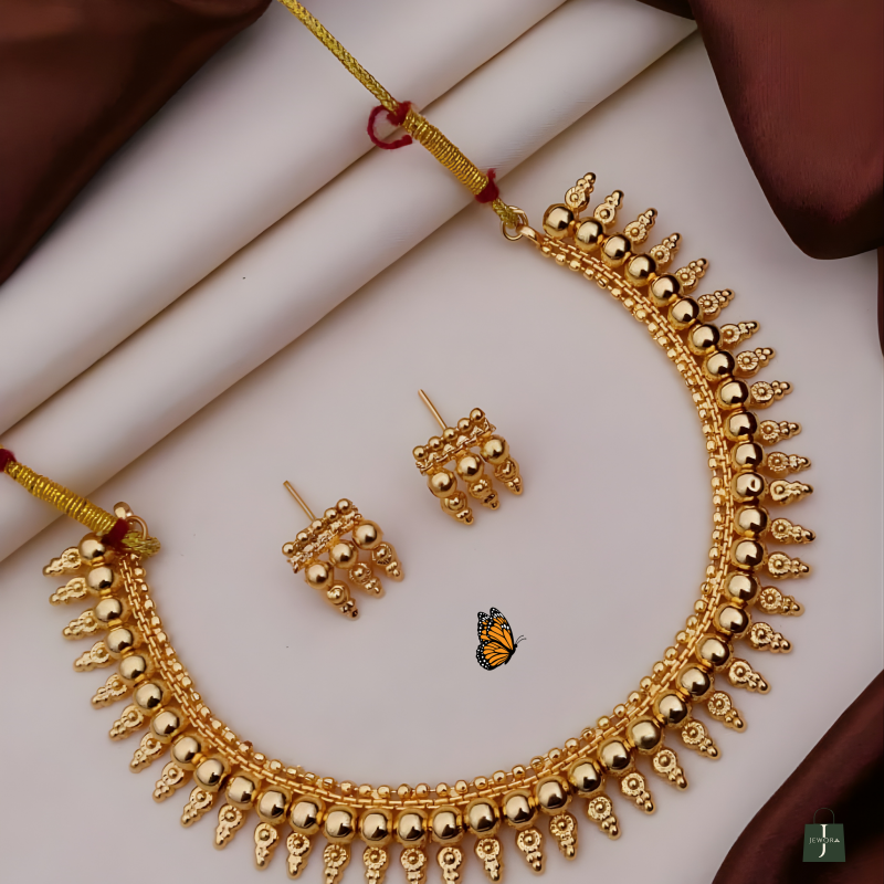 Hasdi-inspired necklace set, beautifully crafted in high-quality brass with a rich golden finish. Designed to reflect classic tribal and ethnic aesthetics, this statement piece features perfectly rounded gold-toned beads with delicate hanging accents that create a bold yet graceful look.