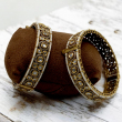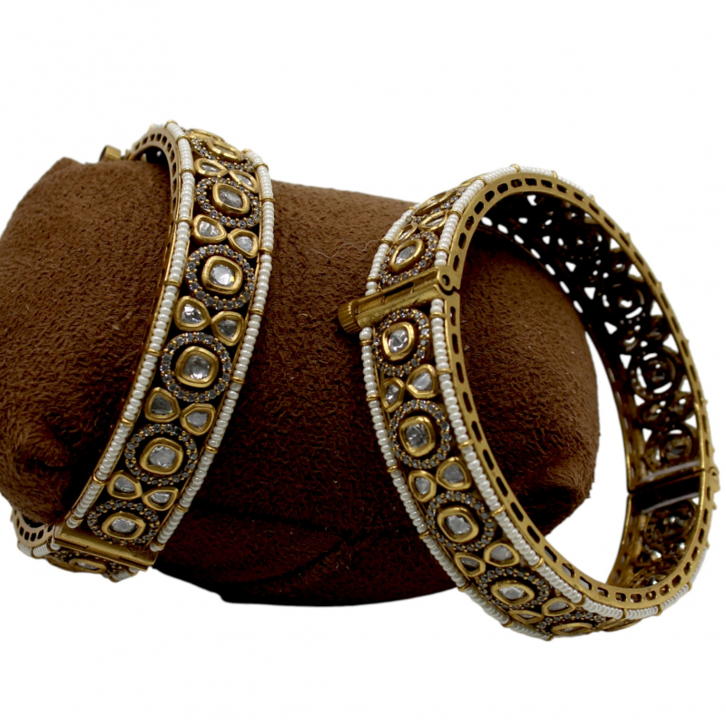 Add timeless elegance to your traditional collection with these beautifully crafted kundan kada bangles. Designed with a continuous pattern of teardrop and oval-shaped kundan stones, these bangles are framed with delicate ivory pearl lining on both edges. The rich antique gold finish enhances the brilliance of the clear stones, giving a royal and graceful look. Perfect for weddings, festive occasions, and ethnic celebrations, these bangles offer both sophistication and durability.