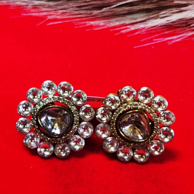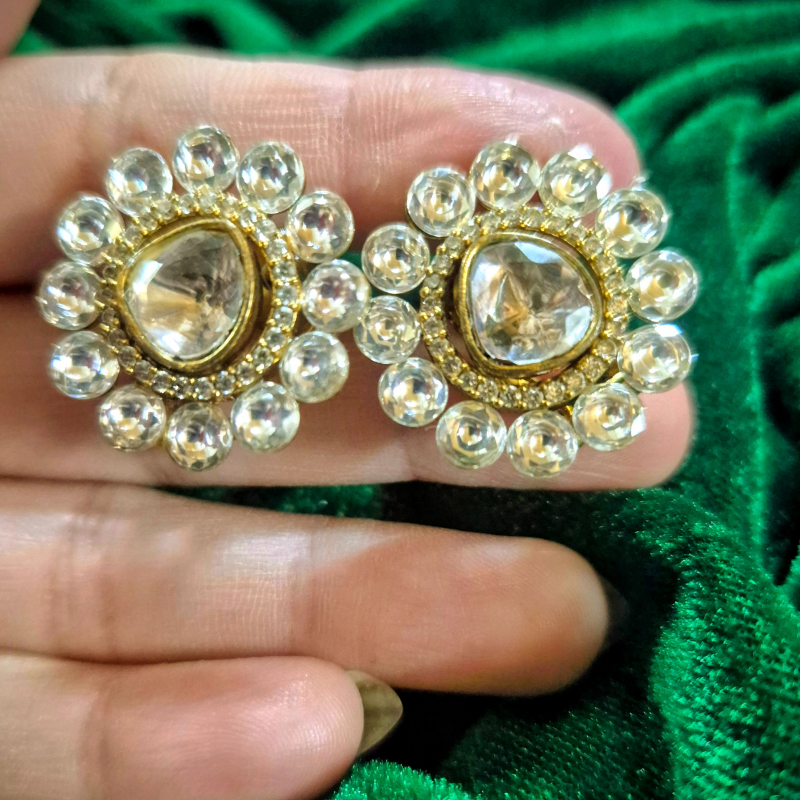 Add timeless elegance to your jewelry collection with these beautifully crafted Kundan halo stud earrings. Featuring a central faceted Kundan stone, each earring is surrounded by a radiant halo of round crystal stones that create a stunning sunburst effect. The gold-tone finish enhances the richness of the design, making these studs perfect for both everyday elegance and festive occasions. Lightweight and versatile, they offer a perfect blend of tradition and modern charm.