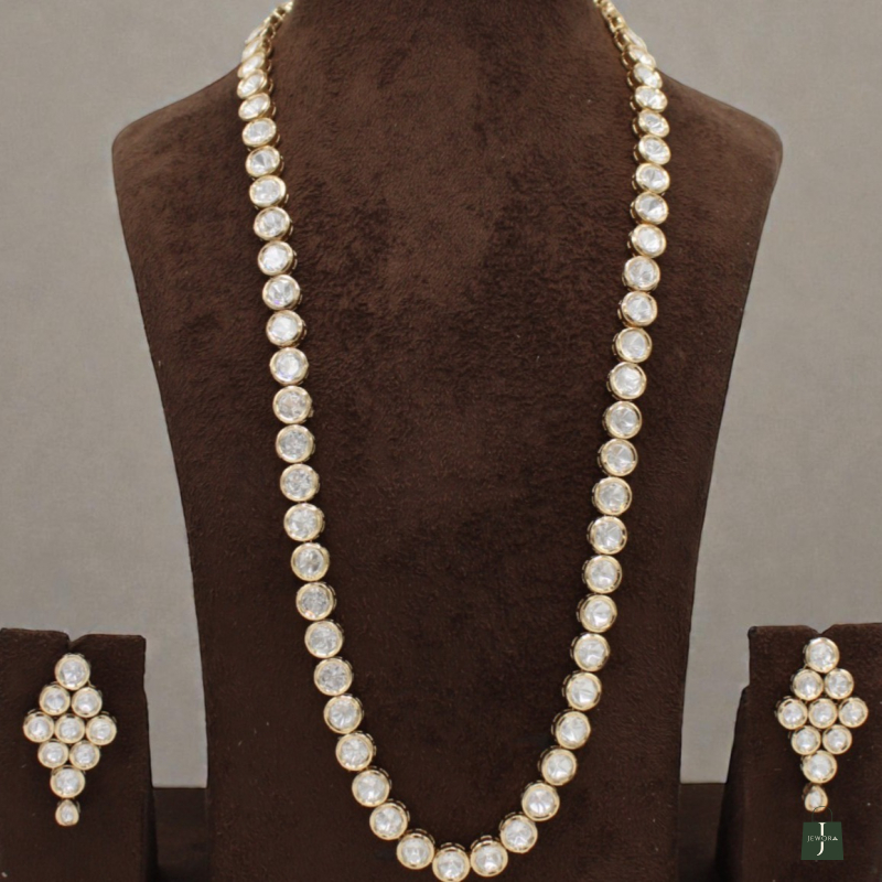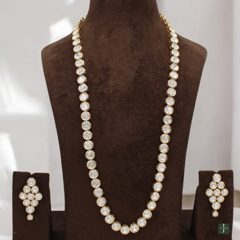 Grace meets royalty in this beautifully crafted Rajwadi Classic Kundan Linea Haar Set. Designed with a sleek single-line arrangement of round Kundan stones, this necklace offers a refined and sophisticated traditional look.