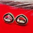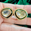 Bring timeless elegance to your jewelry collection with these classic Kundan teardrop stud earrings. Featuring a clear faceted Kundan stone at the center, these earrings are beautifully framed with a rich dark green enamel border and delicate golden bead detailing. The combination of traditional craftsmanship and subtle modern touch makes them perfect for both ethnic and fusion styling. Lightweight yet eye-catching, these studs are ideal for festive occasions and everyday elegance.