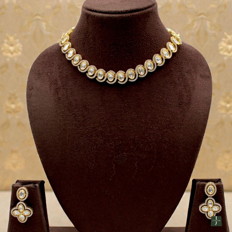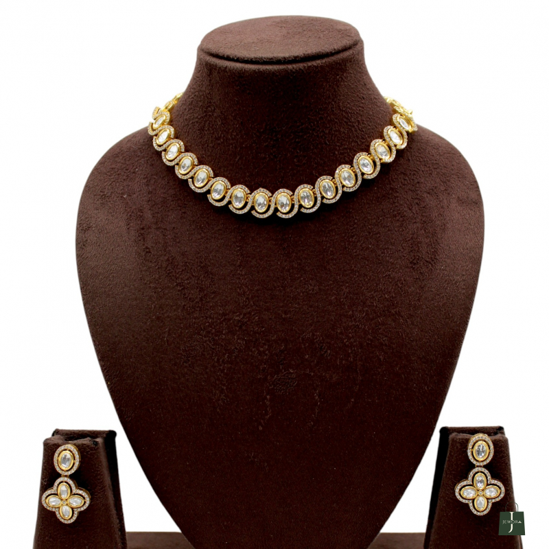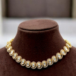 This elegant Kundan necklace set features a refined row of oval-shaped Polki stones, beautifully aligned to create a sleek and graceful neckline finish. The symmetrical design gives it a clean, sophisticated appeal, making it perfect for those who prefer subtle luxury over heavy bridal styles.