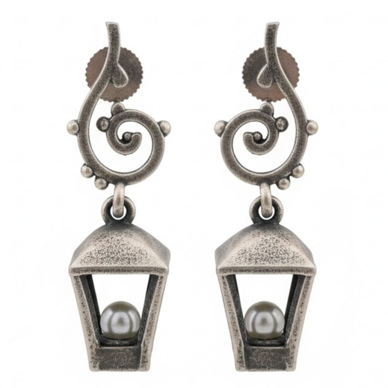 Make a charming style statement with these beautifully crafted oxidised silver-plated lantern dangler earrings. Designed with intricate swirling patterns at the top and a vintage lantern motif at the bottom, each earring features a pearl bead inside, adding elegance and a touch of tradition. The antique finish enhances the handcrafted look, making these earrings perfect for pairing with ethnic wear like sarees, kurtis, lehengas, and Indo-western outfits. Lightweight and comfortable, these earrings are ideal for women and girls who appreciate unique, artisanal jewellery with a cultural touch.
