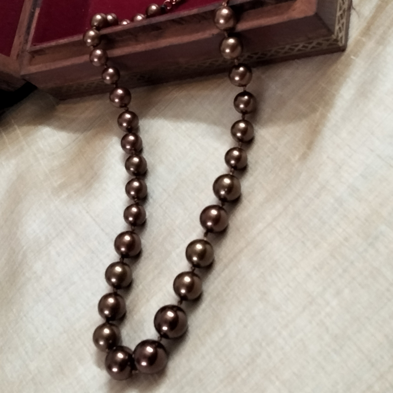 Pearl necklace with graduated pearl sizes, larger pearls at the center tapering to smaller ones towards the clasp.