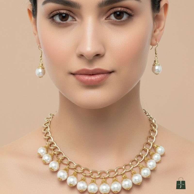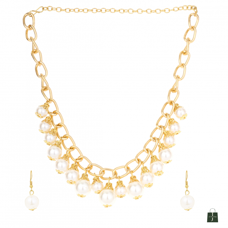 This Classic Pearl Drop Chain Necklace Set is a timeless and elegant piece designed to add a touch of sophistication to your look. Crafted with high-quality alloy metal and finished with rich gold polish, this necklace features beautifully arranged ivory white synthetic pearls that create a graceful drop pattern. The bold chain style gives it a modern statement appeal, while the pearl drops add a traditional charm, making it perfect for both ethnic and fusion outfits.