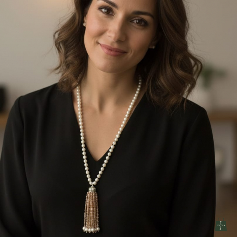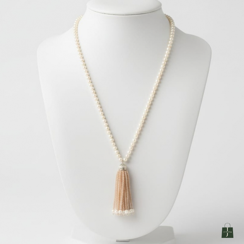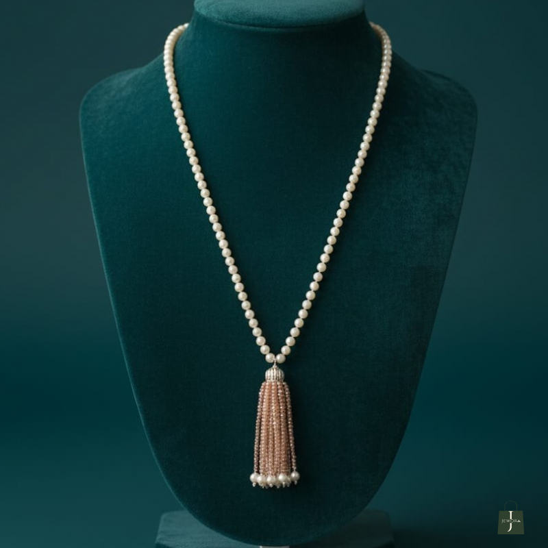 The soft pearl sheen paired with the flowing tassel design creates a look that is both modern and timeless. Perfect for festive gatherings, traditional events, formal occasions, or elegant day wear, this necklace adds effortless charm to any outfit.