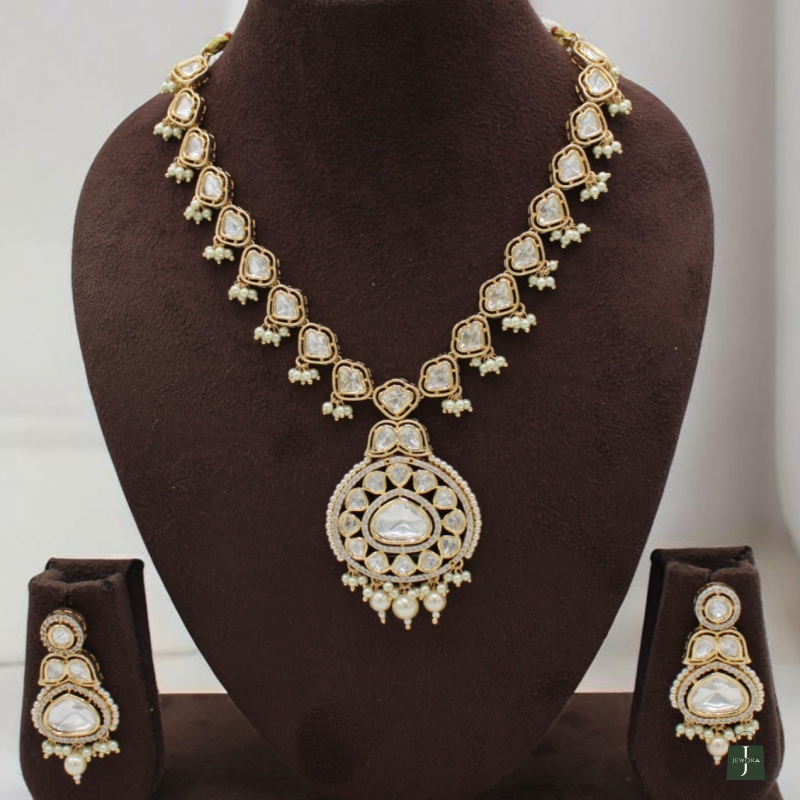 Add timeless elegance to your jewellery collection with this Classic Polki Heart Drop Necklace Set. Designed with beautifully aligned heart-shaped Polki stones, this long necklace features delicate pearl cluster drops that enhance its graceful charm.