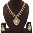 The highlight of the set is the bold circular statement pendant, adorned with uncut Polki stones and bordered with fine detailing. The pendant is finished with soft pearl danglings, giving it a rich traditional look. Paired with matching drop earrings, this set is perfect for wedding functions, festive wear, and traditional occasions.