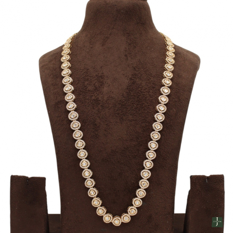 Add refined elegance to your jewellery collection with this beautifully crafted long Polki haar necklace. Designed in a single continuous line of evenly spaced teardrop-shaped Polki stones, this piece offers a graceful and sophisticated look.