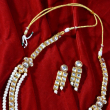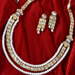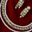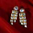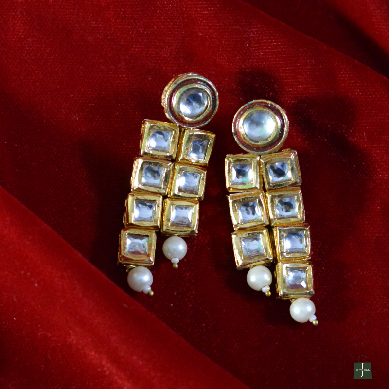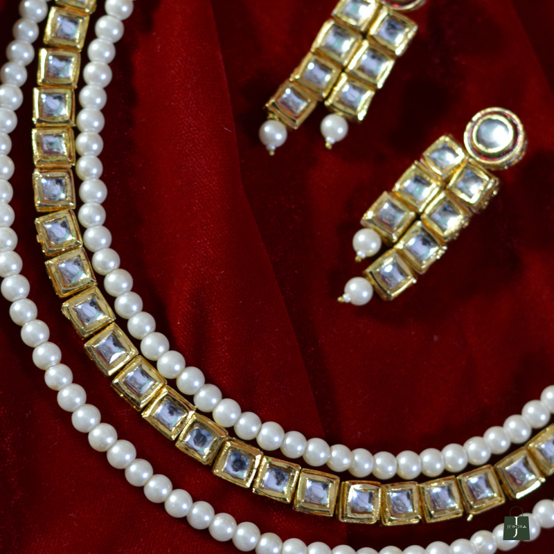 This classic square Polki pearl bridal necklace set showcases structured stone settings softened by delicate pearl accents. The harmonious design delivers a regal bridal presence while maintaining lightweight comfort, making it a versatile choice for weddings, receptions, and traditional celebrations.
