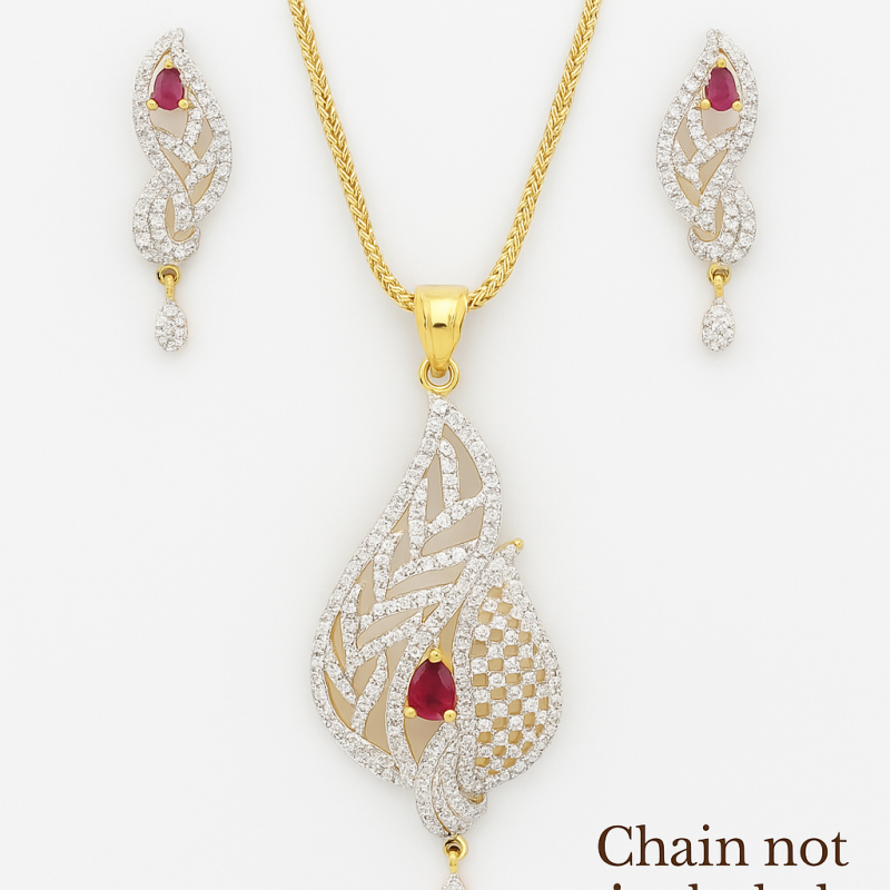 The Crimson Flame Pendant Set is a striking blend of elegance and fiery charm. Designed in a flame-inspired silhouette, it features a vibrant ruby-red stone at its heart, surrounded by glistening American Diamond (CZ) stones. The golden accents and delicate drop details add sophistication, making this set ideal for festive and celebratory occasions.