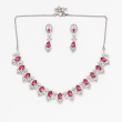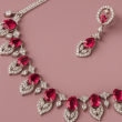 Ignite your style with the bold allure of the Crimson Flame Ruby Necklace Set. This radiant design combines fiery ruby-red stones with sparkling American Diamonds (CZ) in an elegant flame-inspired motif. The teardrop-shaped ruby accents are intricately bordered by shimmering stones, creating a perfect harmony of color and brilliance. The matching earrings echo the same striking design, making this set ideal for festive celebrations, evening parties, and bridal occasions. Crafted with precision and a polished silver finish, this jewelry set exudes glamour while maintaining lightweight comfort for long wear. A timeless choice for those who want to leave a lasting impression with vibrant elegance.