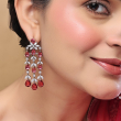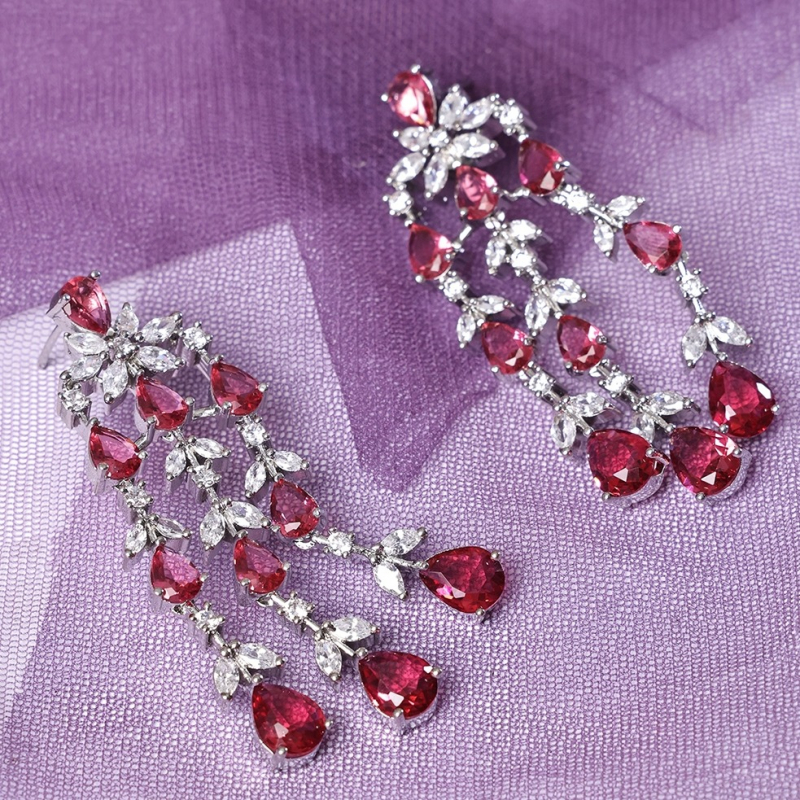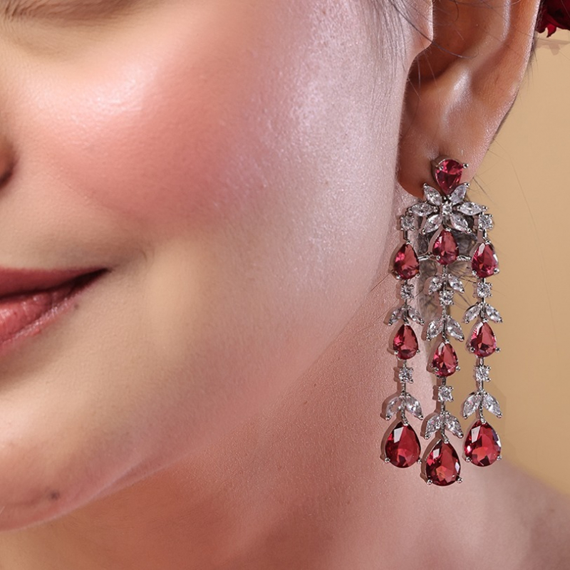 These Crimson Leafdrop Elegance Dangler Earrings are a stunning blend of grace and brilliance. Designed in a delicate leaf pattern, they feature radiant ruby red stones that beautifully contrast with sparkling white diamond-like accents. The drop-style design adds a sense of movement and sophistication, making them perfect for elevating any look. Finished with a sleek silver polish, these earrings exude a modern yet timeless charm. Their intricate detailing and shimmering stones catch the light effortlessly, creating a dazzling effect. Lightweight and comfortable, they are ideal for festive occasions, parties, or special events, adding a bold and elegant touch to your jewelry collection.