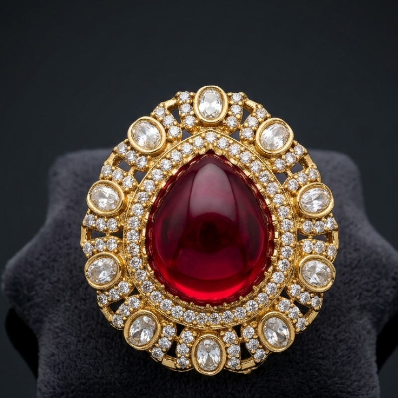 A stunning gold-toned ring featuring a large, pear-shaped red gemstone at its centre, surrounded by two concentric circles of sparkling white zirconia or crystal stones. The outer rim showcases five oval-cut clear stones set among smaller brilliants, adding an elegant vintage touch. Ideal for formal wear or ethnic outfits, this eye-catching accessory adds regal charm to any ensemble.