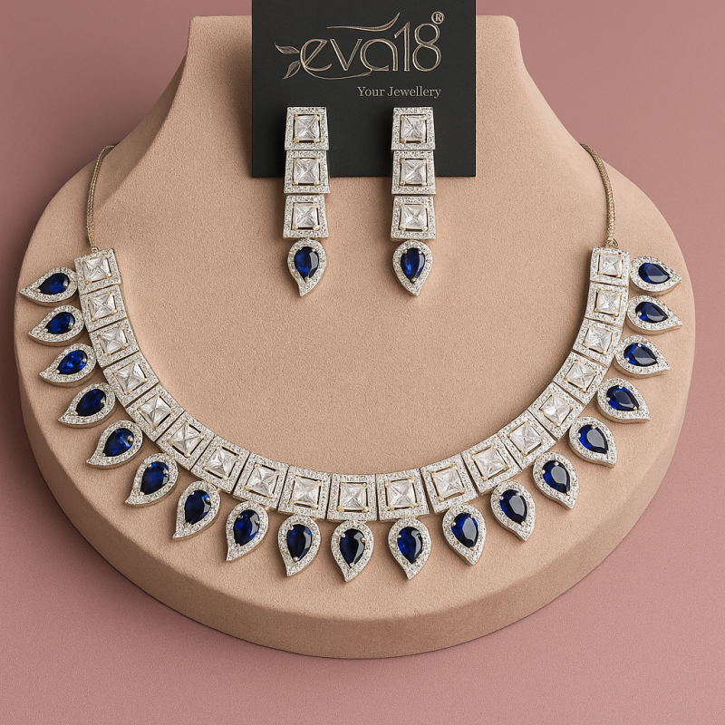 Bold and majestic, the Crimson Royale Necklace Set radiates regal charm with its striking combination of rich ruby-red stones and shimmering American Diamonds (CZ). The collar-style necklace features alternating geometric square links and teardrop ruby accents, each framed with delicate pavé settings that add depth and brilliance. Designed for maximum sparkle, the layout gracefully contours the neckline, making it an instant showstopper at weddings, parties, or festive occasions. The matching earrings carry forward the same design elements, blending square cuts with ruby teardrops for a refined, balanced finish. Crafted on a sturdy alloy base with a sleek silver polish, the set combines modern craftsmanship with timeless grandeur. If you are seeking a jewelry piece that blends elegance with bold color, this set brings sophistication and standout beauty to every ensemble. Pair it with sarees, lehengas, or gowns for a luxurious, catalog-worthy look that always draws attention.