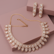 Bold and majestic, the Crimson Royale Necklace Set radiates regal charm with its striking combination of rich ruby-red stones and shimmering American Diamonds (CZ). The collar-style necklace features alternating geometric square links and teardrop ruby accents, each framed with delicate pavé settings that add depth and brilliance. Designed for maximum sparkle, the layout gracefully contours the neckline, making it an instant showstopper at weddings, parties, or festive occasions. The matching earrings carry forward the same design elements, blending square cuts with ruby teardrops for a refined, balanced finish. Crafted on a sturdy alloy base with a sleek silver polish, the set combines modern craftsmanship with timeless grandeur. If you are seeking a jewelry piece that blends elegance with bold color, this set brings sophistication and standout beauty to every ensemble. Pair it with sarees, lehengas, or gowns for a luxurious, catalog-worthy look that always draws attention.