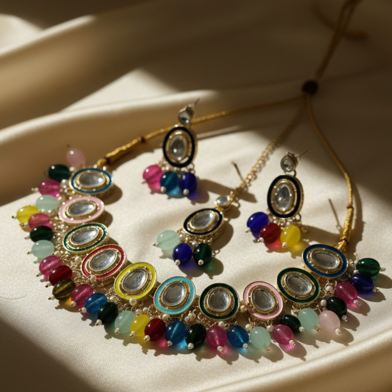 Turn heads at every celebration with our Glam Shimmer Partywear Necklace. Crafted with a radiant shimmer finish, this necklace adds the perfect touch of sparkle to your party and festive outfits. Its elegant design pairs beautifully with both ethnic and western wear, making it a versatile must-have accessory. Lightweight, comfortable, and eye-catching, it’s ideal for weddings, parties, and special occasions where you want to shine with confidence. βœ¨πŸ’Ž