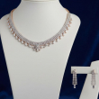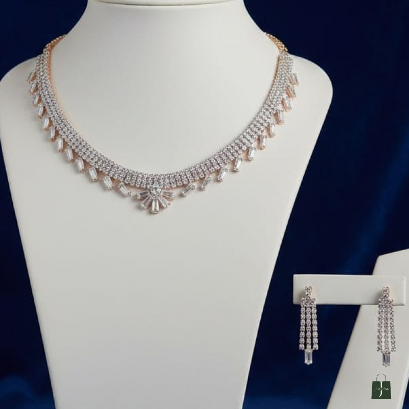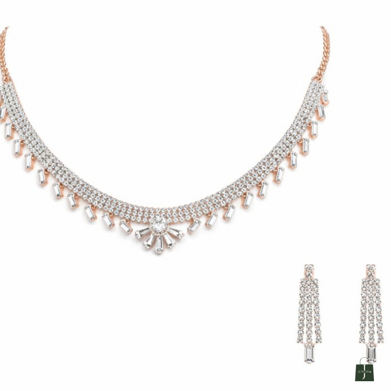 A timeless and refined choker set crafted with dazzling white stones arranged in a layered micro-setting design. The delicate fringe pattern features baguette-style drops, highlighted by a subtle floral-inspired center motif that adds a graceful charm. Paired with matching multi-line drop earrings, this set is perfect for receptions, engagement ceremonies, cocktail parties, and elegant festive occasions. Its minimal yet luxurious appeal makes it suitable for both ethnic and contemporary outfits.