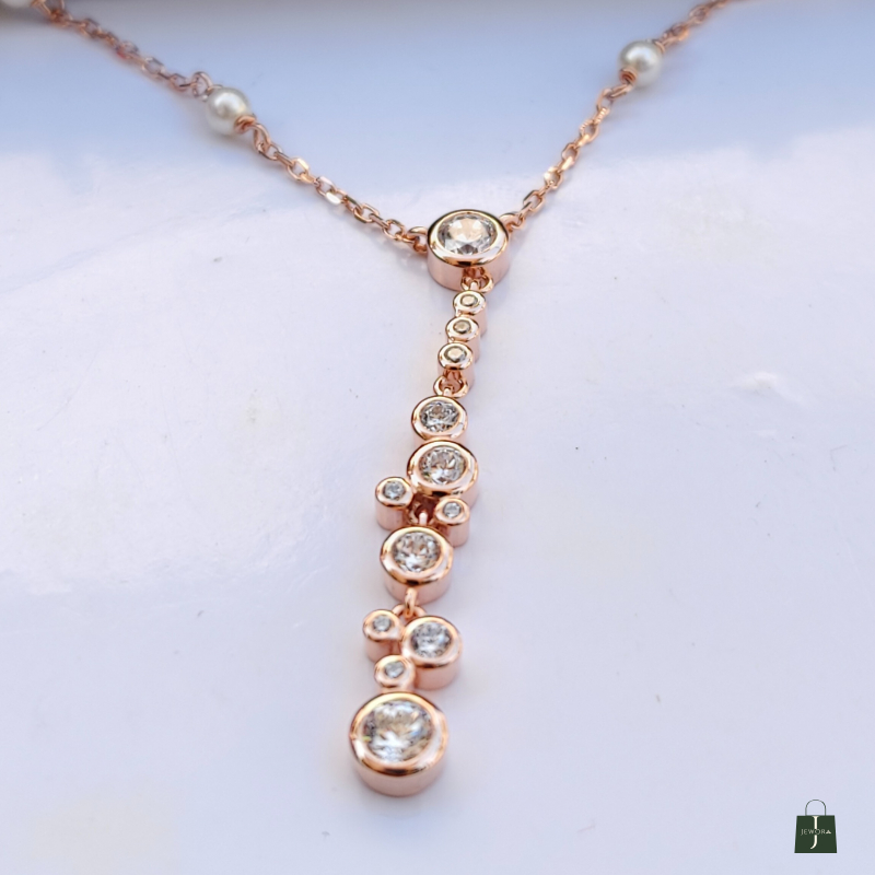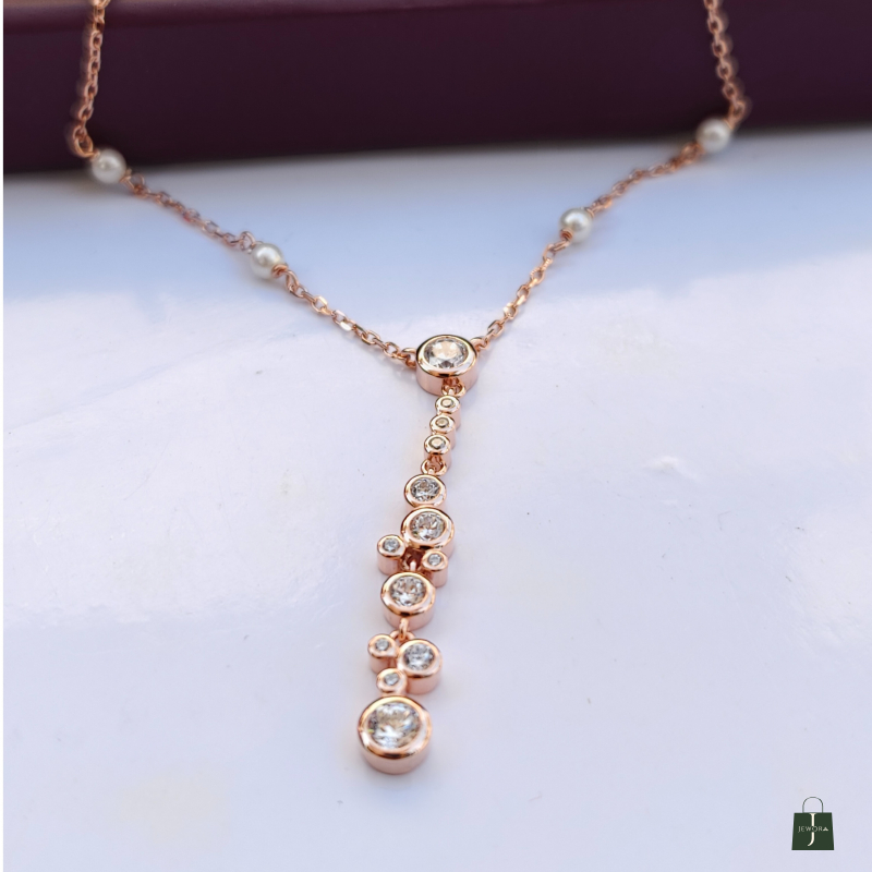 Adorned with fine zircons & delicate pearl accents. Perfect for parties, gifting & daily sophistication. A graceful stream of brilliance flows down your neckline. Each zircon sparkles with quiet elegance and poise. Minimal, modern, and crafted to complement every look
