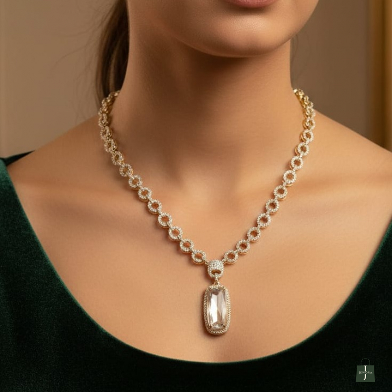 The elongated pendant design enhances the neckline, while the matching earrings add balanced glamour to complete the look.
