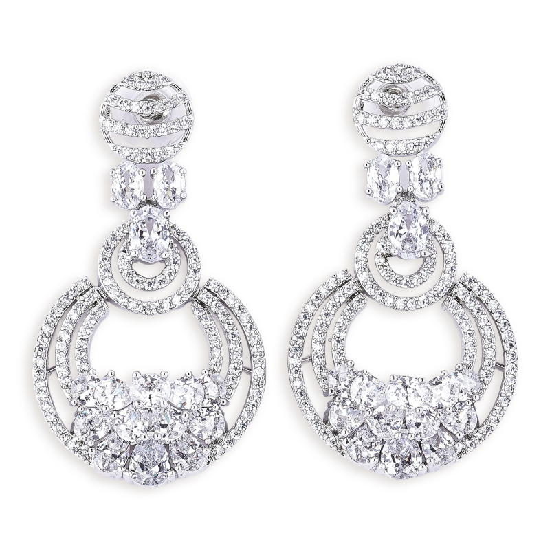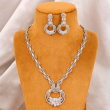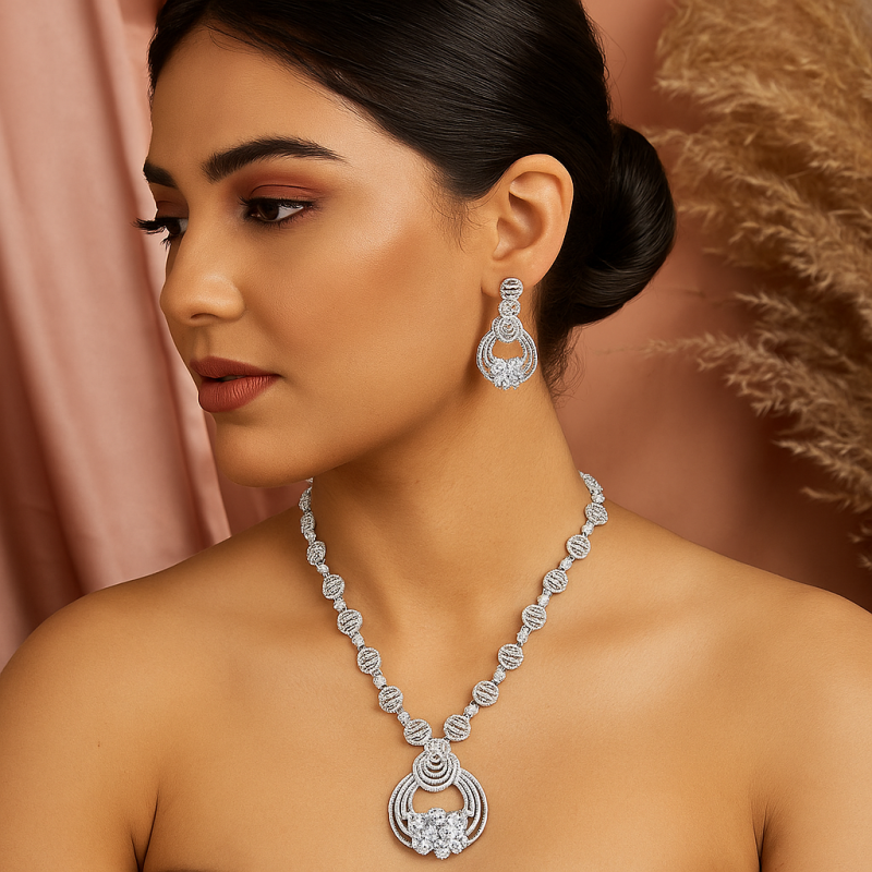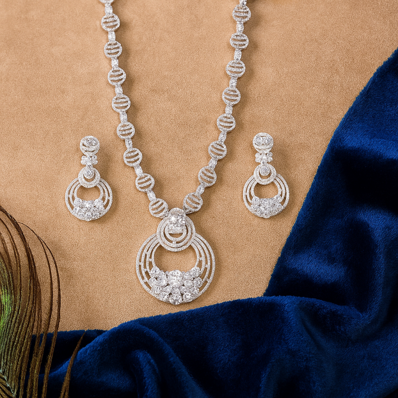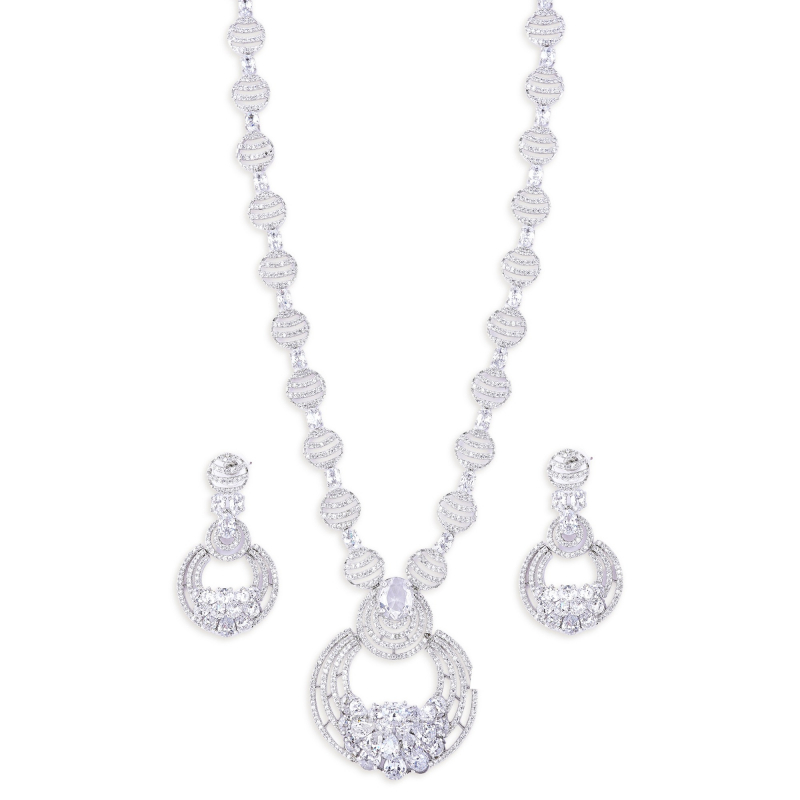 This American diamond rhodium plated luxurious shine necklace set made with exquisite craftsmanship paired with matching earrings, This design adds a touch of elegance to any outfit