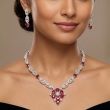 Elevate your look with this exquisite Crystal Halo Jewellery Set, featuring a beautifully crafted necklace and matching drop earrings. The necklace showcases a stunning feather-leaf motif adorned with sparkling white crystals and deep ruby-toned stones in a graceful halo design, secured with a reliable lobster claw clasp on a 45.72 cm chain. The matching drop earrings mirror the necklace's design with cascading ruby-toned stones framed by brilliant crystal clusters, measuring 3.5 cm in length with push-back findings. Finished in high-polish white gold plating with rhodium-plated accents, the set weighs approximately 70 grams. Ideal for weddings, anniversaries, engagements, and formal celebrations, this jewellery set pairs beautifully with traditional Indian attire as well as contemporary evening wear, making it a perfect choice for brides and those seeking a regal, luxurious appeal. The set includes 1 necklace and a pair of drop earrings. Please refer to the size guide before ordering.