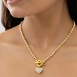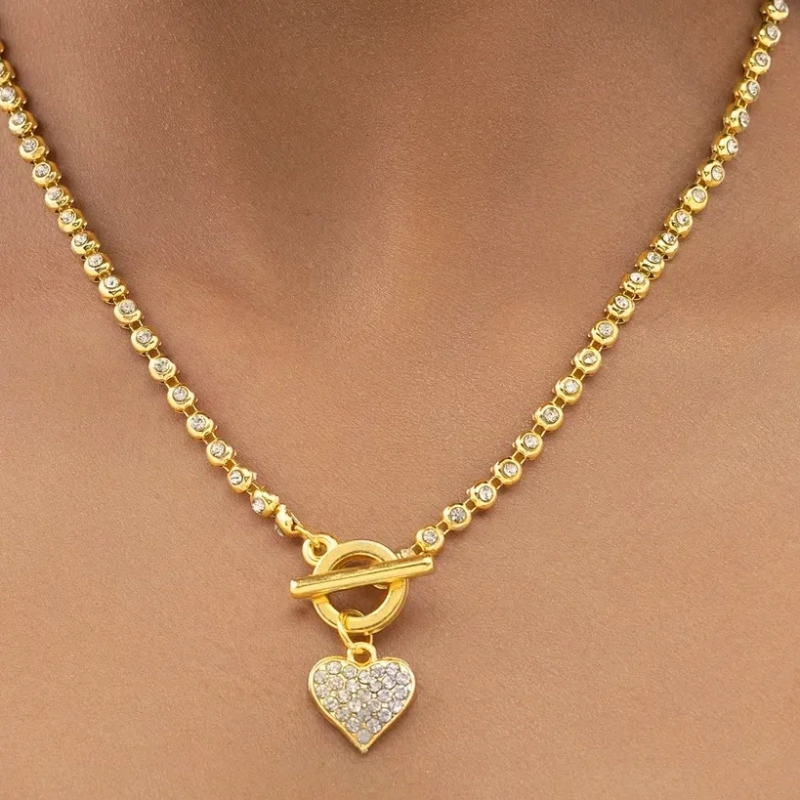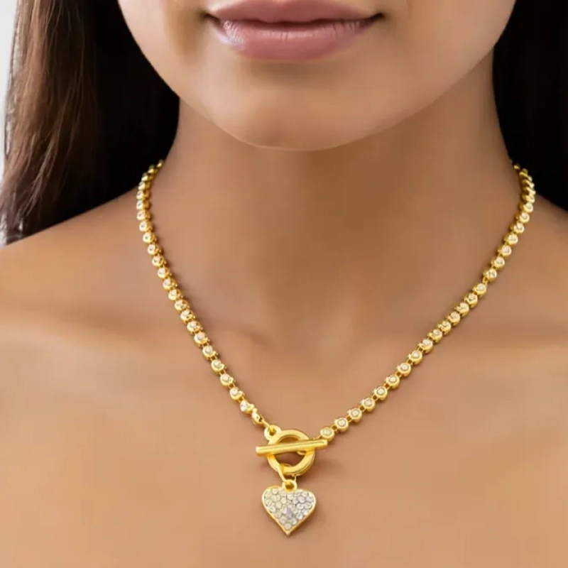 Elegant and meaningful, Ushve’s Crystal Heart Toggle Necklace is designed to celebrate timeless romance with a modern touch. The delicate chain features finely detailed links that reflect light beautifully, creating a subtle sparkle that enhances its graceful look. At the center sits a charming heart pendant adorned with shimmering crystals, symbolizing love and connection. The stylish toggle clasp adds both functionality and design appeal, giving the necklace a contemporary edge while keeping the heart charm beautifully framed at the front. Lightweight and comfortable, this necklace rests gently along the neckline, making it perfect for everyday elegance as well as special occasions. Whether worn alone as a romantic statement or layered with other pieces for a trendy stacked look, it brings effortless sophistication to any outfit. Thoughtfully crafted with Ushve’s signature blend of modern design and accessible luxury, this necklace is a beautiful keepsake that combines sparkle, style, and sentiment.