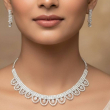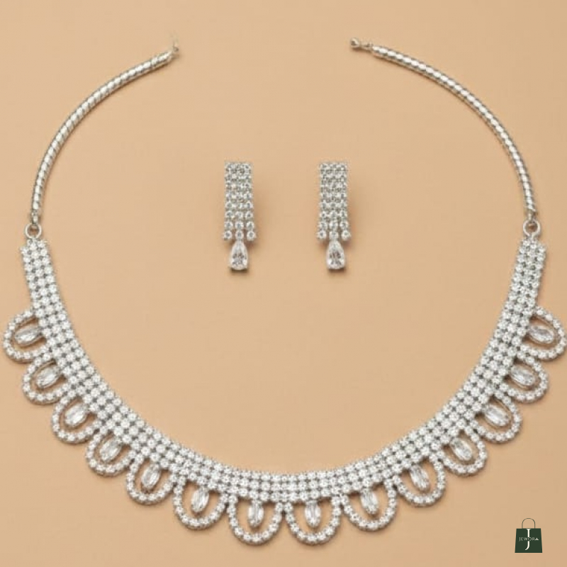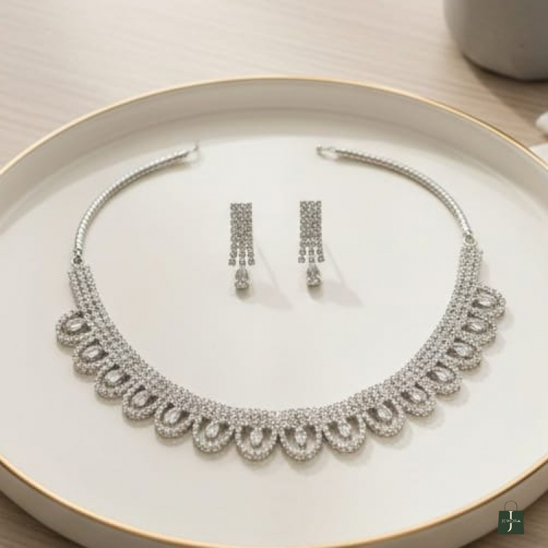 Elegant and timeless, the Crystal Lace Scallop Necklace Set is designed to exude refined sophistication. Featuring a beautifully crafted scalloped pattern, this necklace is adorned with rows of sparkling white American diamonds arranged in delicate loop motifs. The structured yet graceful design sits perfectly along the neckline, creating a soft lace-like effect. Paired with coordinated drop earrings, this set is ideal for weddings, receptions, festive occasions, and elegant evening wear.