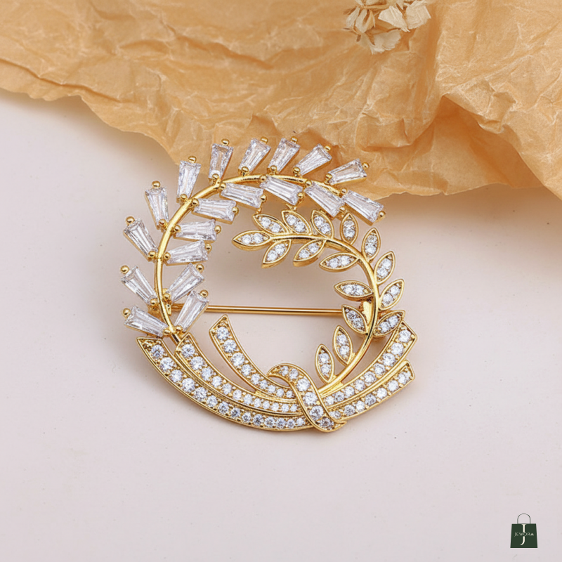 Elevate your ensemble with this exquisite crystal-embellished brooch pin featuring a stunning leaf design. Crafted in a sophisticated two-tone finish of gold and silver, this elegant accessory showcases intricate floral patterns adorned with sparkling rhinestones. The graceful curves and delicate branches create a mesmerising botanical motif that catches and reflects light beautifully. Perfect for adding a touch of glamour to formal wear, evening gowns, or everyday outfits, this versatile brooch pin serves as both a statement piece and a refined accent. The detailed craftsmanship is evident in every element, from the precisely placed crystals to the seamless blend of metallic tones. Whether pinned to a lapel, scarf, or handbag, this brooch adds a sophisticated finishing touch to any look. The secure pin closure ensures your brooch stays perfectly positioned throughout wear. An ideal accessory for special occasions, weddings, or whenever you want to add a spark of elegance to your attire.