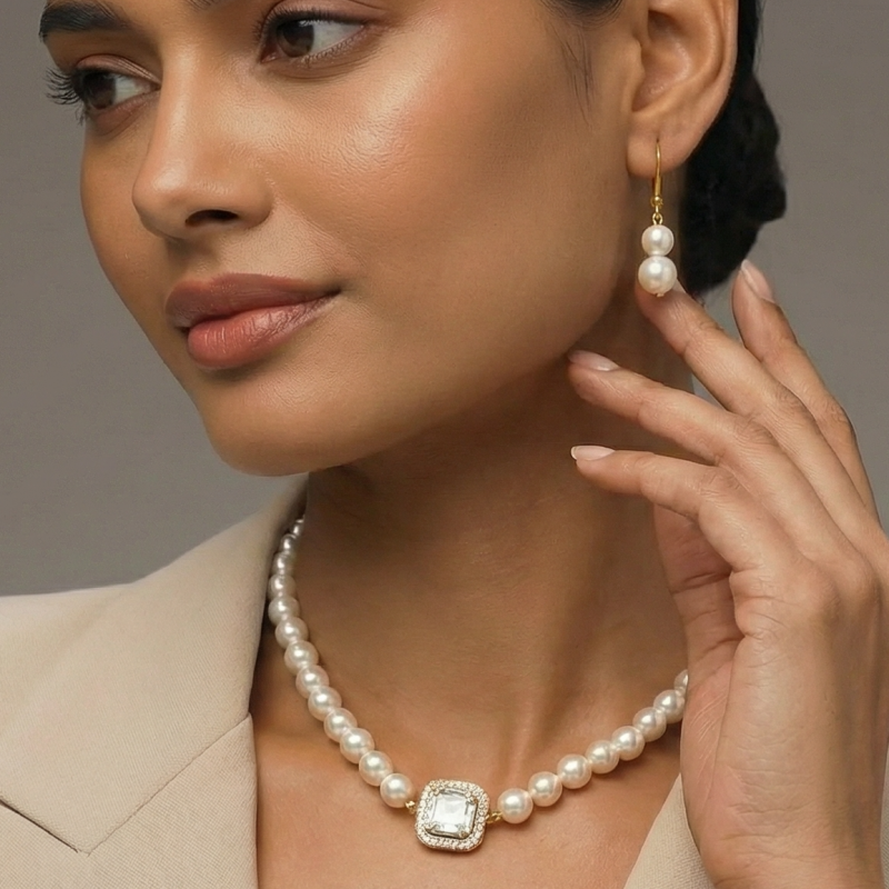 Graceful and timeless, Ushve’s Crystal Pearl Pendant Necklace Set blends classic pearl beauty with delicate crystal sparkle. The necklace features a refined row of luminous pearls highlighted by an elegant crystal centerpiece that adds subtle brilliance to the design. The balanced composition creates a sophisticated focal point along the neckline, while the soft pearl finish enhances the piece’s timeless charm. The polished gold-tone detailing complements the pearls and crystals, giving the necklace a refined and graceful glow. Matching pearl drop earrings complete the coordinated set, adding a delicate finishing touch. Lightweight and comfortable, this jewellery set is perfect for weddings, festive occasions, evening events, or elegant everyday styling. Designed with Ushve’s signature touch of accessible luxury and timeless design, this set brings classic elegance and soft sophistication to any jewellery collection.