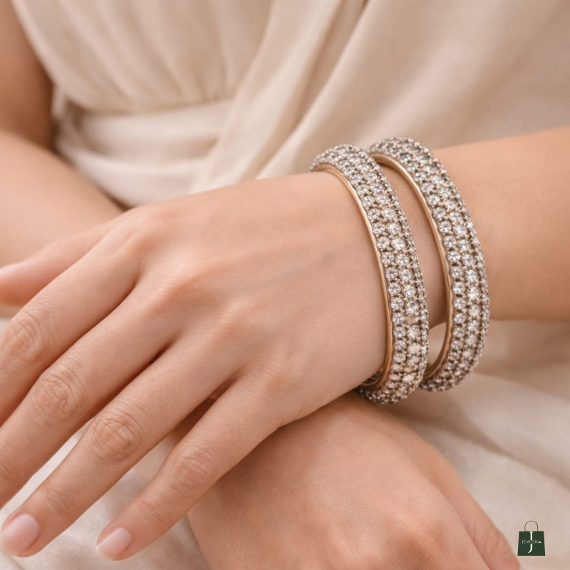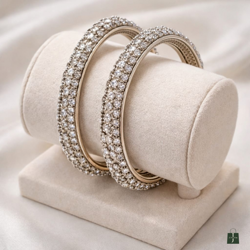 A stunning pair of crystal-studded bangles designed to add timeless sparkle to your jewellery collection. Crafted with shimmering stones set in a refined gold-tone finish, these bangles reflect elegance, sophistication, and festive glamour.