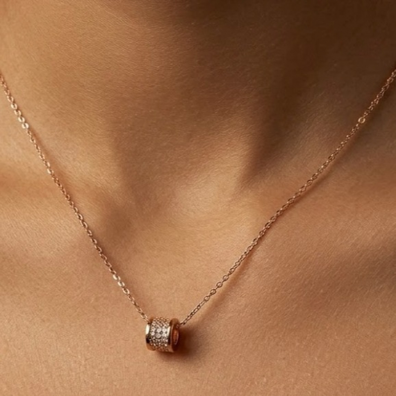Elegant CZ barrel pendant necklace with beautiful rose gold polish and sparkling stones. Simple and stylish design, perfect for daily wear and special occasions.
