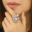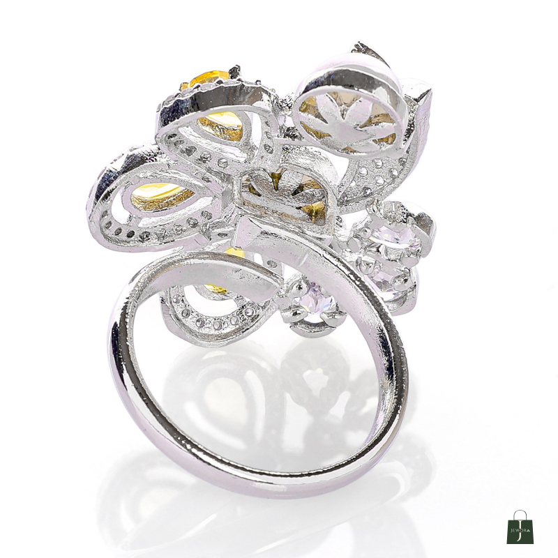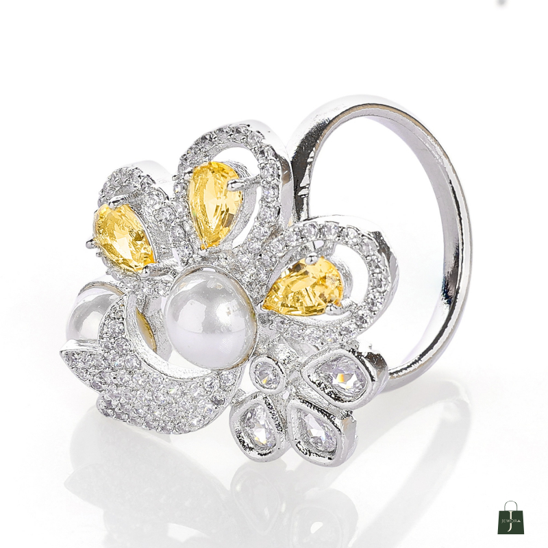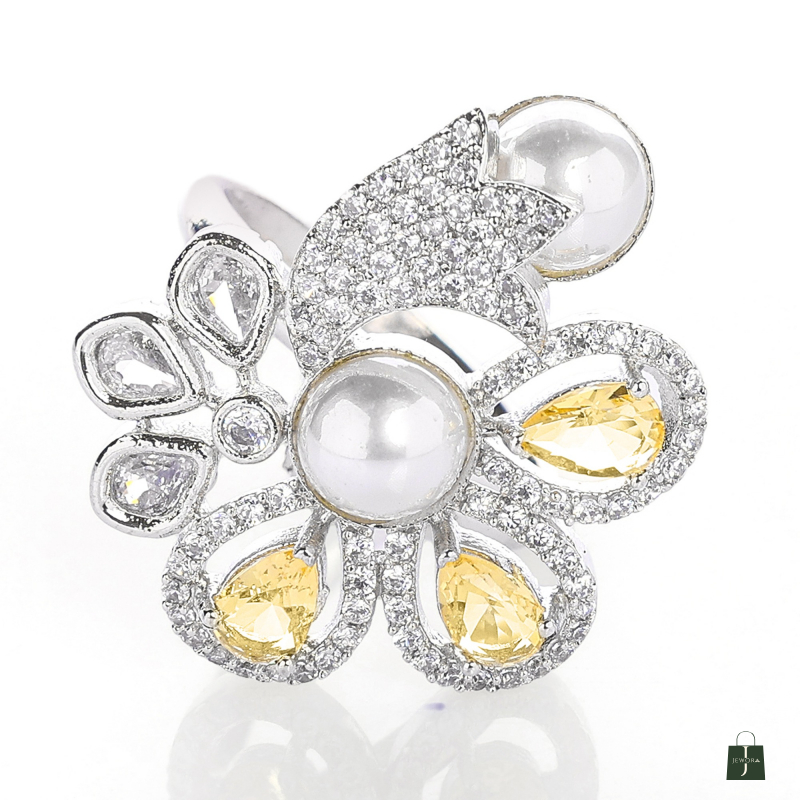 This Ring made of alloy metal with rhodium plated , Crafted with a high-quality finish Cubic Zirconia Stone with pearl & Monalisa Stone