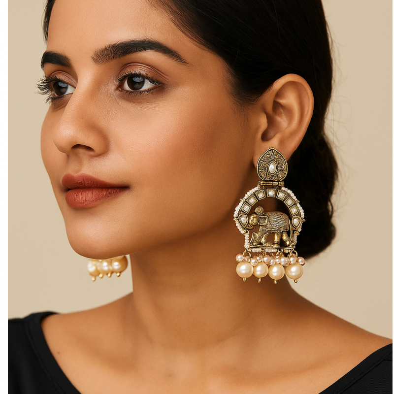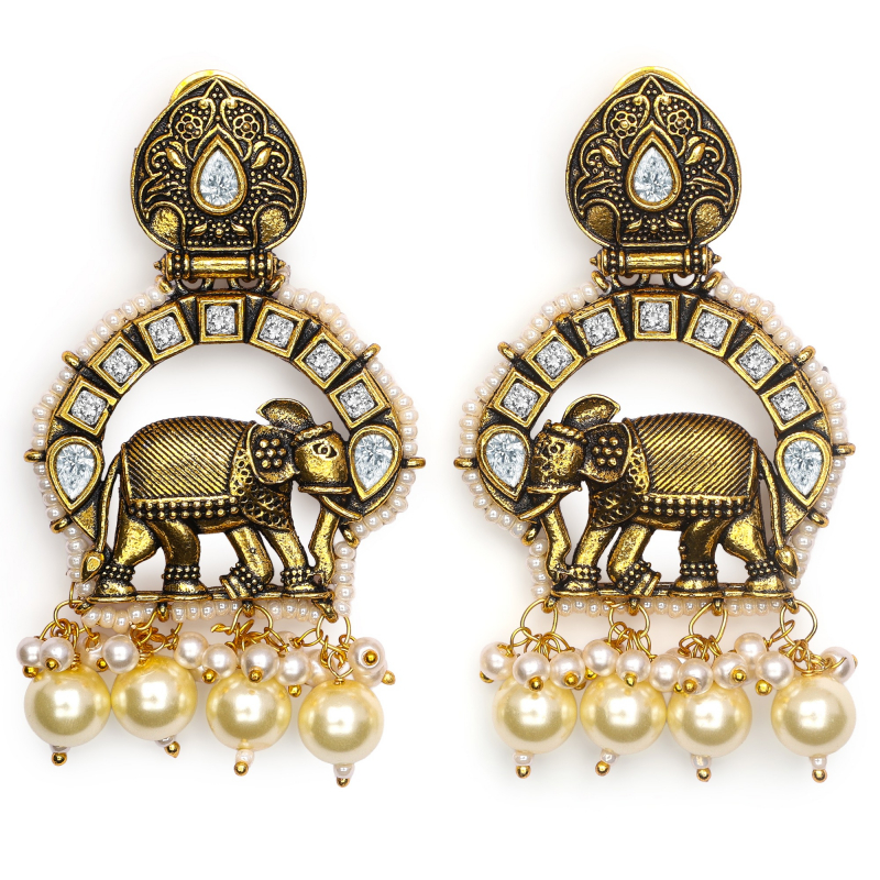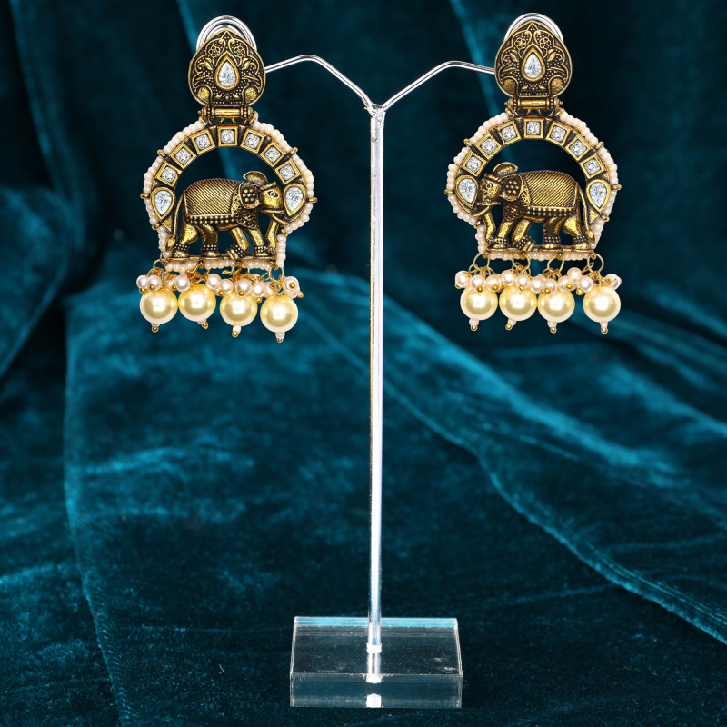 Antique-finish dangle earrings showcasing intricately carved royal elephant (haathi) motifs .Embellished with kundan-style square and teardrop stones for a heritage appeal.