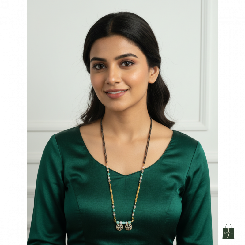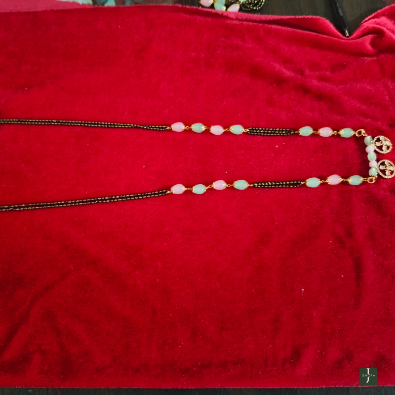 This elegant dual-tone mangalsutra features a unique combination of black beads, pastel beads, and gold-tone elements, creating a modern yet traditional aesthetic. The necklace is beautifully adorned with two intricately designed floral pendants that add charm and sophistication. Its lightweight construction and stylish color contrast make it perfect for daily wear as well as festive occasions. A classy and contemporary mangalsutra crafted to enhance your ethnic look.