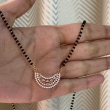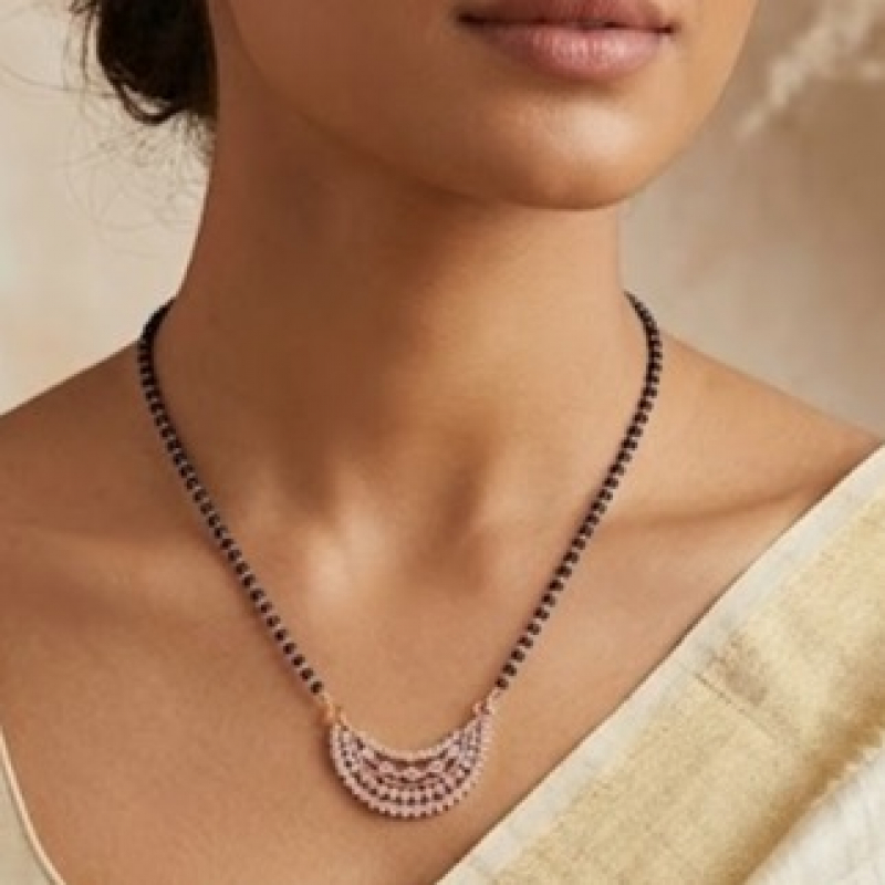 Elegant CZ rose gold short mangalsutra featuring a fine black beaded chain paired with a graceful layered pendant. The pendant showcases multiple curved rows of sparkling cubic zirconia stones in a delicate, cascading design, finished in a warm rose gold tone. Lightweight and stylish, itβs perfect for daily wear with a touch of festive elegance.