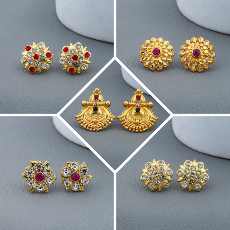 Upgrade your jewellery collection with this beautiful 5-pair earrings combo set featuring a mix of floral stud designs, crystal stud earrings, and elegant traditional drop earrings. Crafted with a rich gold-tone finish and sparkling artificial stones, each pair offers a unique style suitable for both traditional and modern outfits.