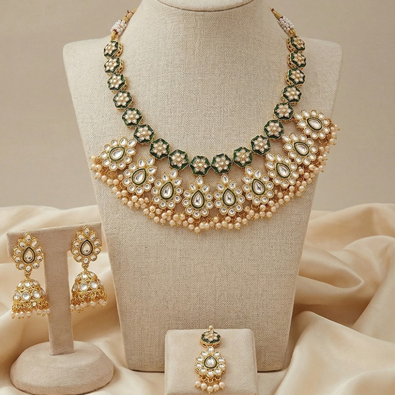 Elevate ethnic occasions with this Designer High Gold Necklace Set in Ethnic Kundan Style with Jhumka Earrings. Featuring uncut kundan stones set in ornate antique-inspired motifs with premium high gold polish for radiant shine, the choker necklace pairs with dangling jhumka earrings to create royal splendor for weddings, sangeet, or parties. Lightweight brass construction around 80-120g ensures all-day comfort while complementing sarees, lehengas, or kurtas with authentic heritage glamour.