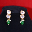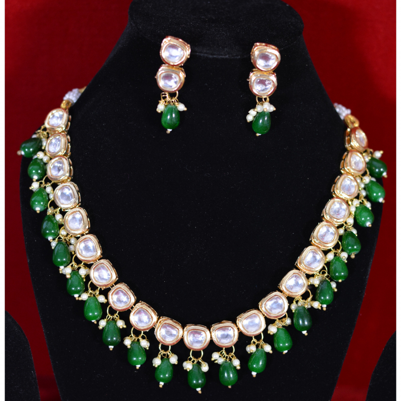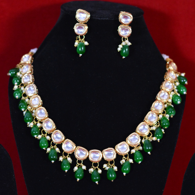 This Designer Kundan Necklace Set features rich green stone drops that add freshness and contrast to its gold-toned design. The elegant detailing and polished finish create a luxury-inspired appearance, making it ideal for weddings, traditional events, and festive occasions at an affordable value point.